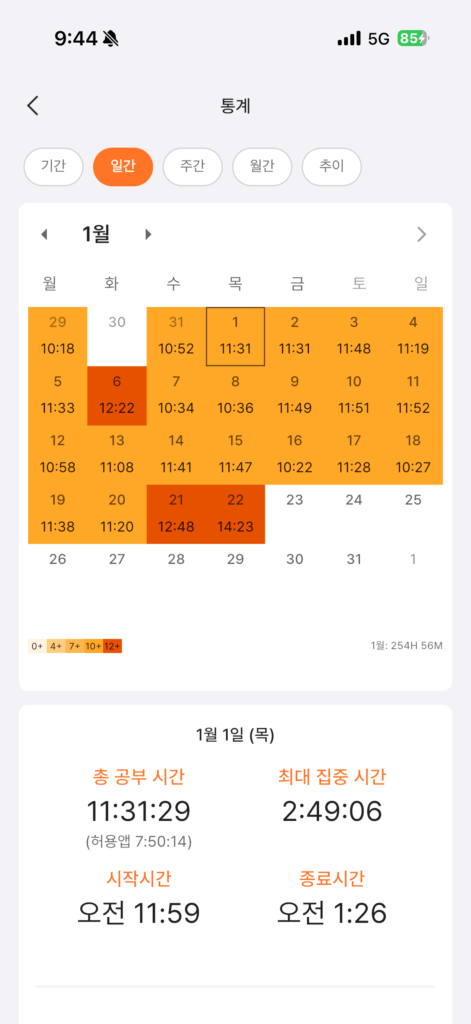 두 번째 모의고사 12월 30일: 249개를 맞았다. 정확한 개수가 생각이 안 나는데 약치를 50개 넘게 맞았었다. 전 모의고사와 난이도 차이가 있긴 하지만 그래도 다행이라는 생각이 들었다. 커트라인으로부터 40개를 정도 더 맞았으니 앞으로 남은 한달 간 열심히 한다면 합격할 수 있겠다는 생각을 했다. 12월과 1월에도 폰 게임도 하고 릴스와 유튜브를 보긴 보았지만 영상 하나를 정말 여러 번에 걸쳐서 나눠서 보고 게임도 하루에 30분 미만으로 했던 것 같다. 인터넷도 여기 저기 기웃거리고 공부 관련 내용의 카톡이 많기는 했으나 카톡은 거의 실시간으로 답장하고 그랬으니 많이 논건가 싶기도 하고