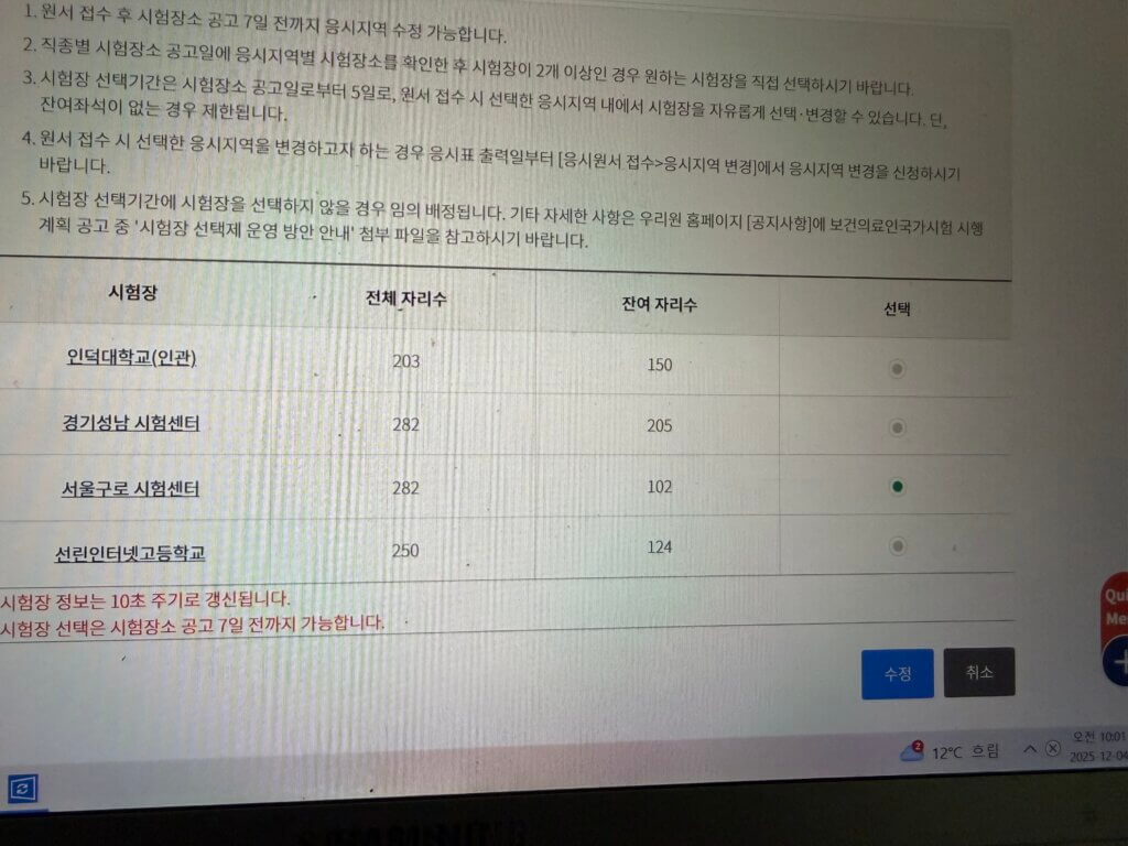 12월 4일에 국가고시 시험 접수가 있었는데 몇 시부터 접수인지 몰라서 그냥 자려고 했다. 그런데 당일 오전 9시에 오전 10시부터 시험장 선택이라고 카톡이 왔다. ㅋㅋㅋ이런 게 어딨어요ㅡㅡ 전날에는 알려줘야지