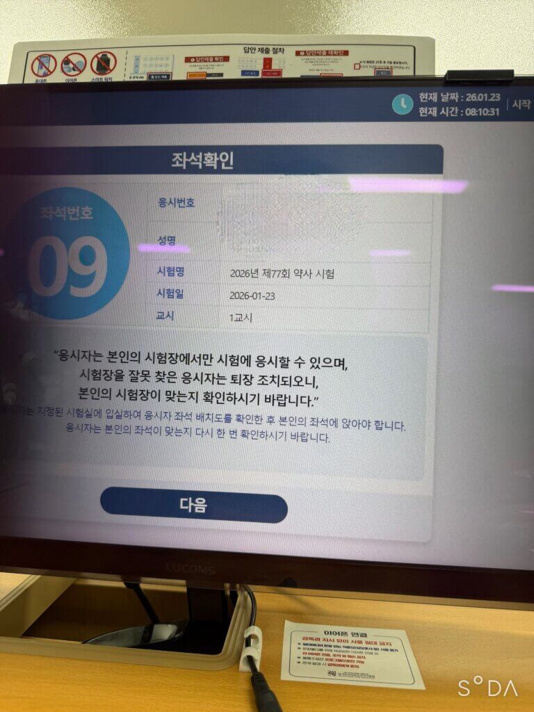 폰에 붙이는 것 같은 사생활보호필름을 컴퓨터에 크게 붙여놔서 시야가 제한이 되었다. 그리고 옆자리를 파일 같은걸로 막아놔서 칸막이가 되어 있었다. 두 자리씩 붙어 있었는데 딸깍대는 소리가 시끄럽게 느껴졌다. 가능했으면 컴퓨터 하나씩 다 떨어뜨려 놓았으면 좋았을 텐데 두 개씩 붙여 놓았다. 지금 이 화면에 보이는 것 같이 내 컴퓨터의 측면도 잘 보이지 않았다. 이게 시험지를 보는 데 아예 영향이 없는 게 아니라 좀 영향이 있었다고 생각된다. 그리고 CBT의 단점 중 하나는 클릭해서 넘겨야지만 남은 문제들이 어떤 것인지 볼 수 있는 것이다. 종이 시험지의 경우에는 그래도 한 눈에 어떤 문제가 남아 있는지 볼 수가 있고 대충 파악도 할 수 있는데 이게 참 단점이었다. 선린인터넷고등학교의 경우에는 이런 필름이 없다고 들었고 고사장은 따뜻하다 못해 더웠다고 나중에 들을 수 있었다. 내가 있었던 고사장의 경우 추워서 발이 시렸다… 중간에 패딩을 입고 시험볼지 말지 고민했다. 핫팩 챙겨오는 게 좋았을 것 같다고 생각함 계산기는 시험 프로그램에 있는 계산기를 사용하면 되는데 하나하나 다 눌러봐야 해서 시간이 좀 걸리고 귀찮을 것 같아 그냥 손으로 계산했다. 2교시의 경우 앞뒤를 꽉 채워서 사용했는데 다 쓰면 종이를 추가할 수 있다고 3교시 때 알려주셨다. ㅋ 그리고 컴퓨터가 중간에 멈추거나 엄청 느린 경우가 졸시가 아닌 국시에서도 발생을 했다. 동기가 그랬었는데 다행히 4교시라서 시간이 좀 널널한 교시였고 부족한 시간만큼을 더 줬다고 한다. 2교시 때 그랬으면 진짜 힘들었을 듯 컴퓨터 관리 좀 잘 해주셨으면